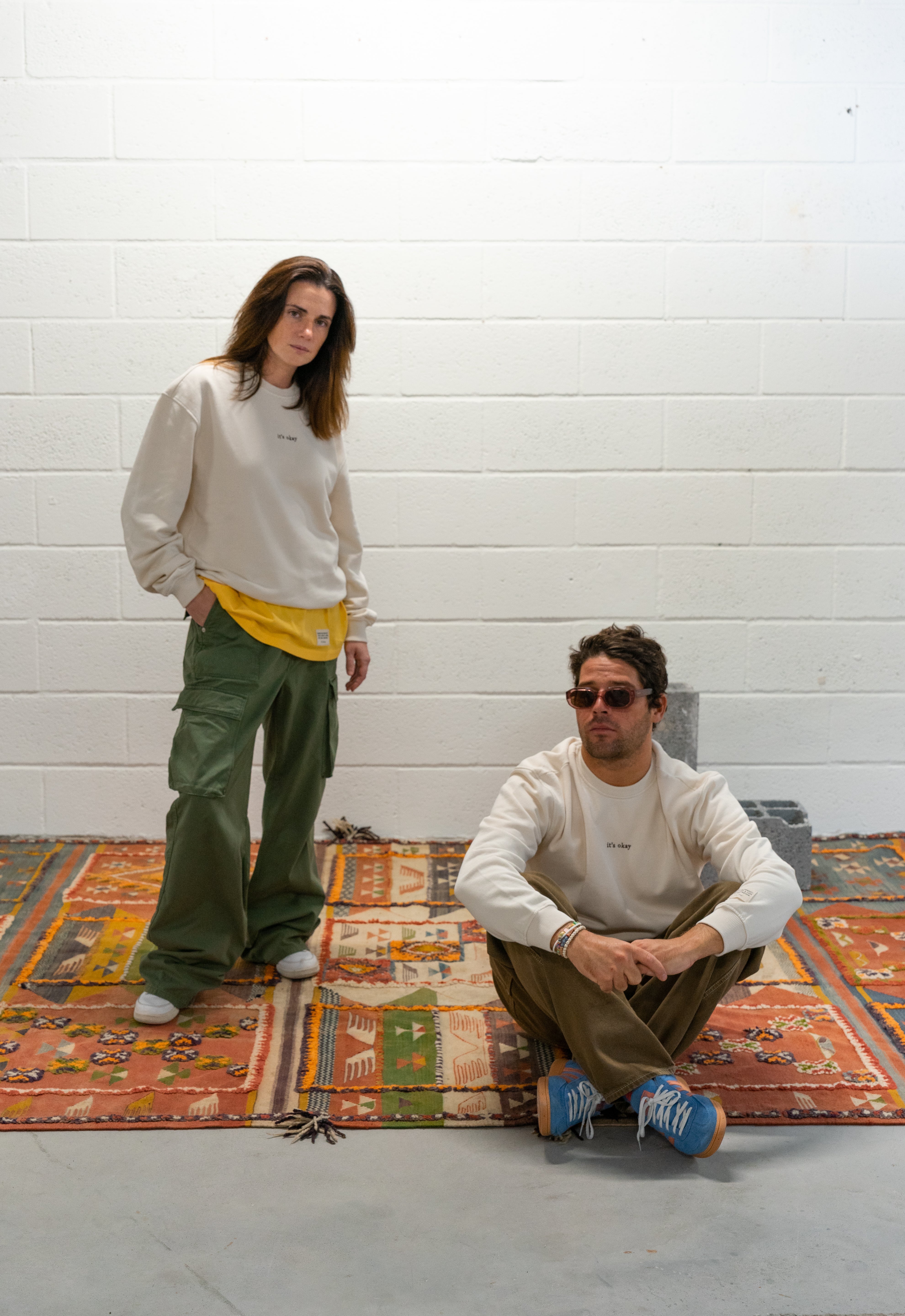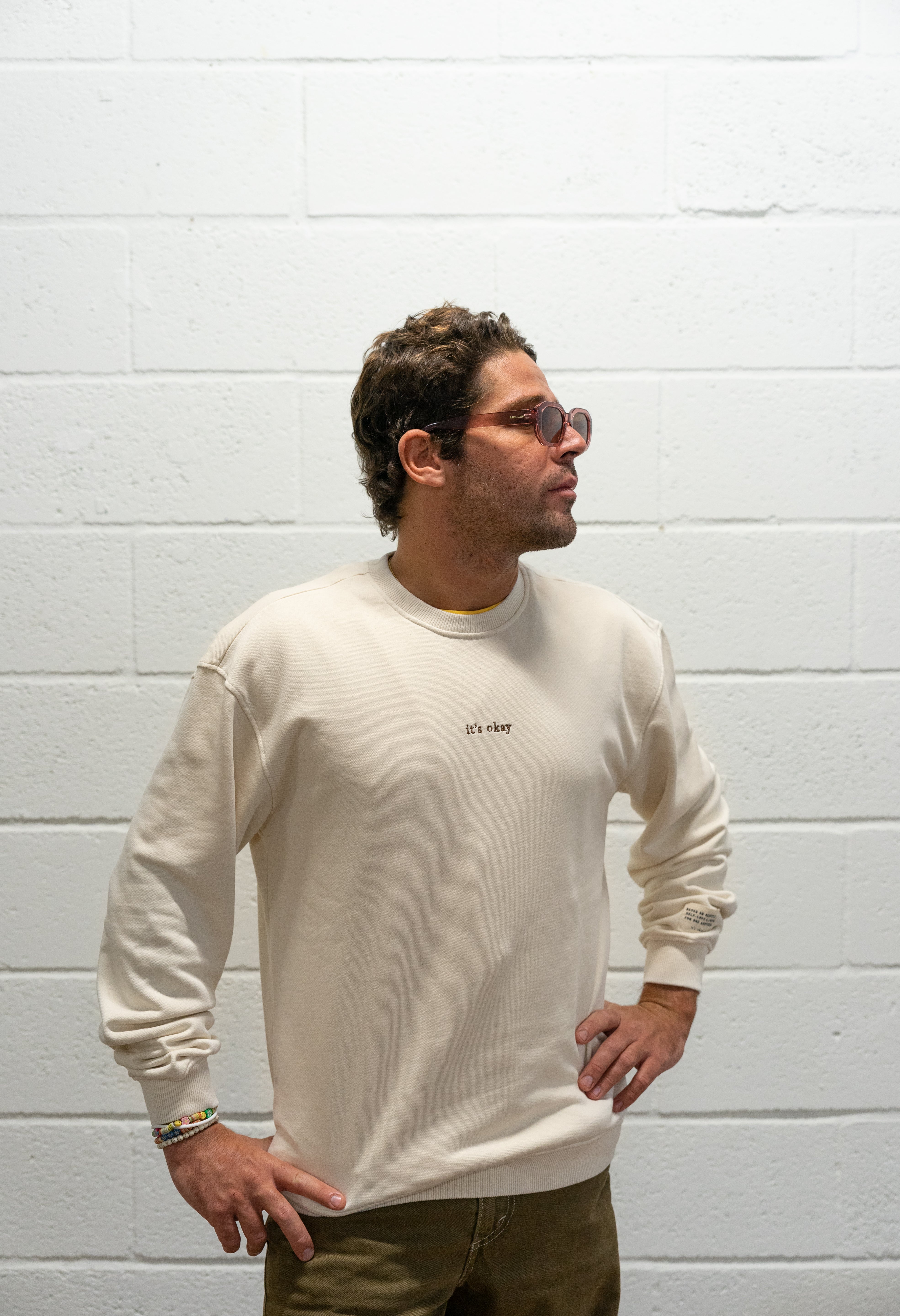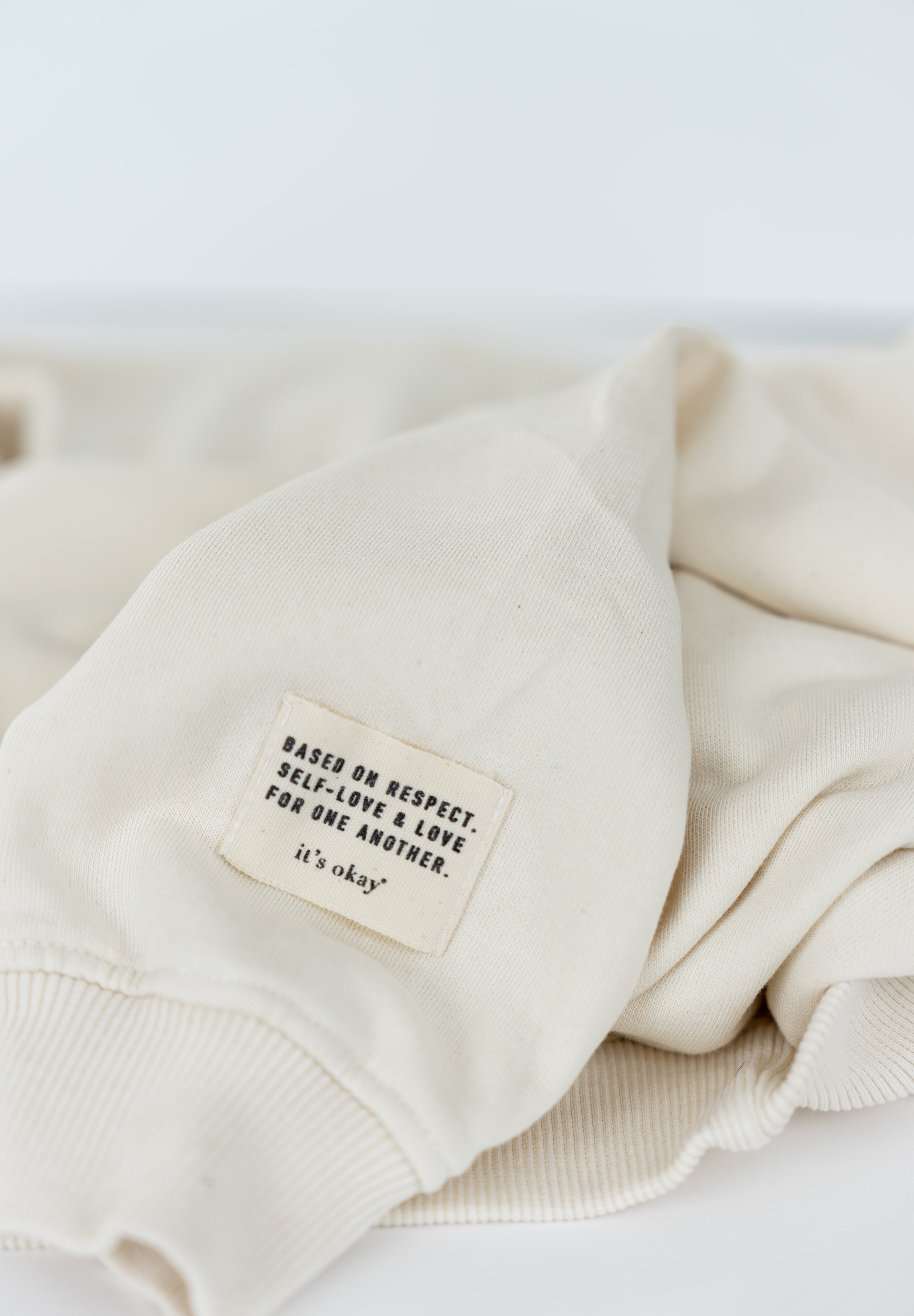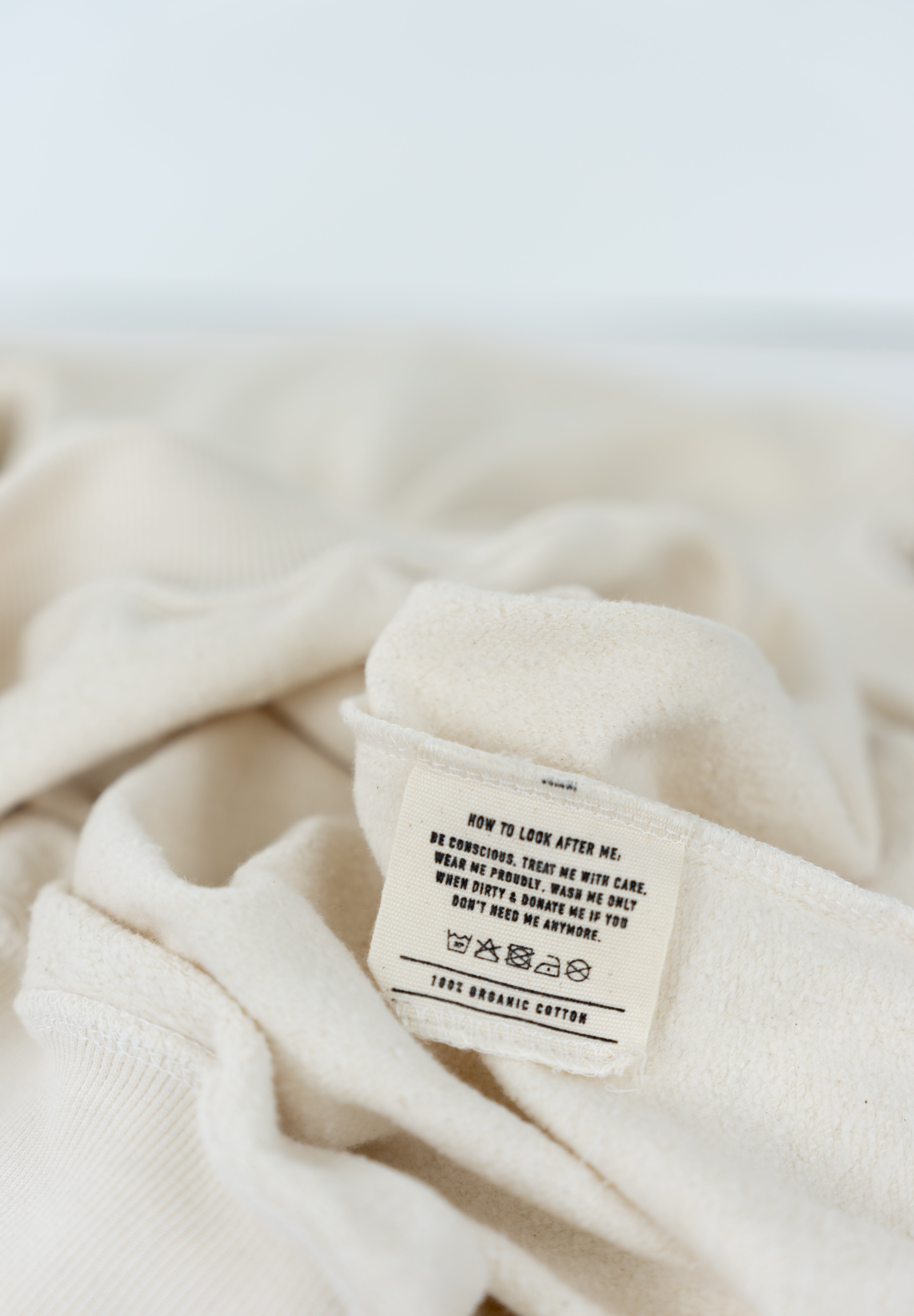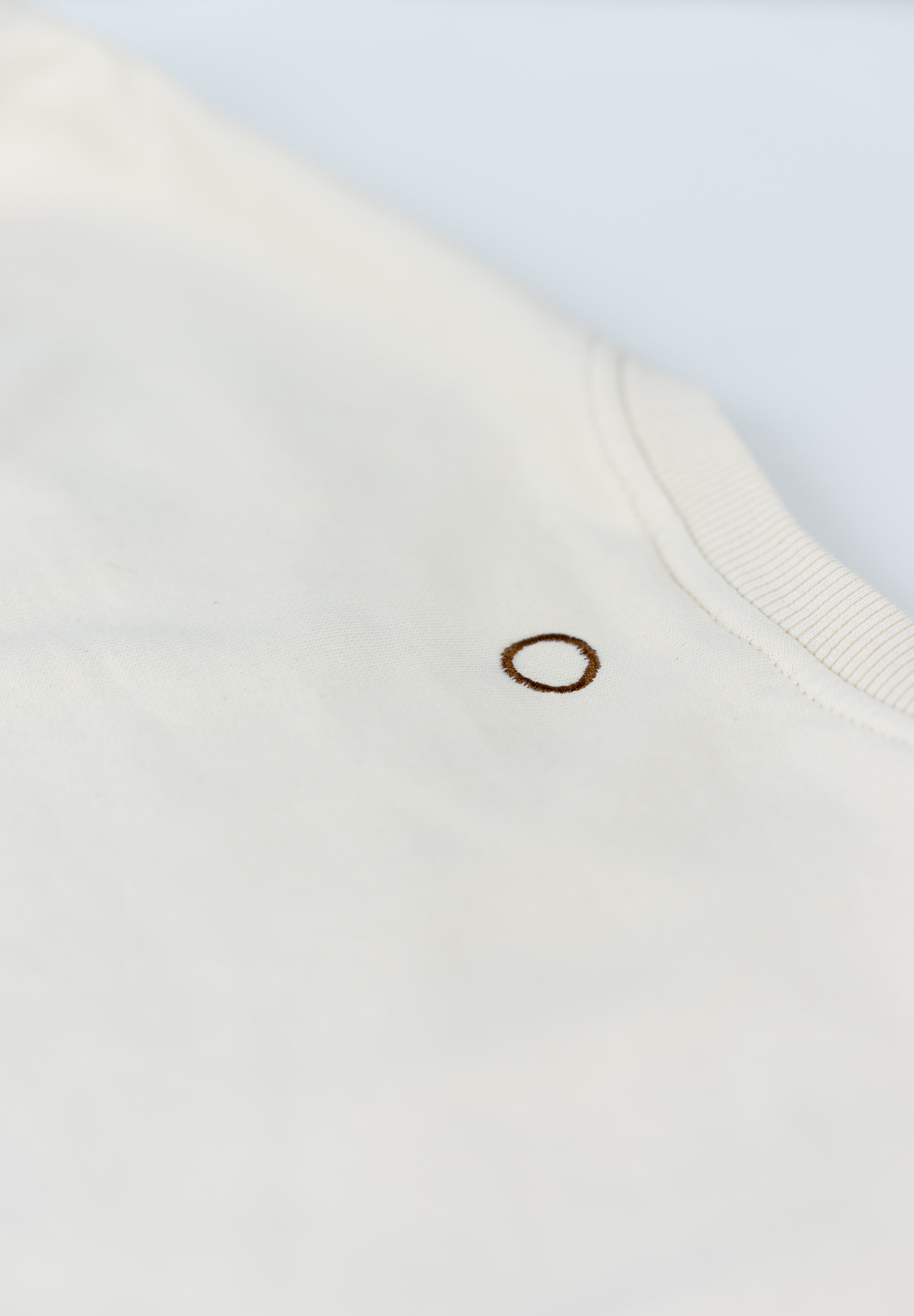 Our off-white crewneck, is a cozy essential for your wardrobe; designed and made in Portugal down to the last detail. It's produced with 300 GSM organic cotton, this crew utilizes virgin cotton without any ink, ensuring a pure and comfortable feel.  Featuring two cool embroideries - one on the front and other on the back. Check out the exterior label on the sleeve, reflecting our values of respect, self-love and love.