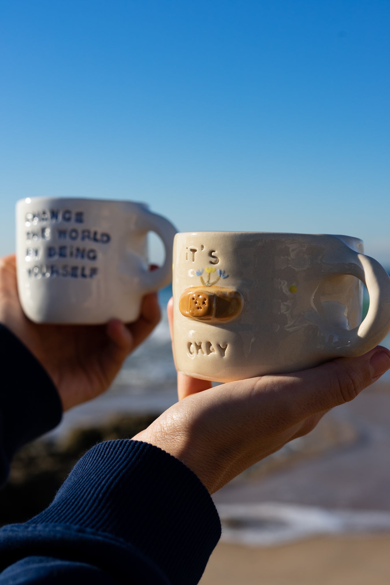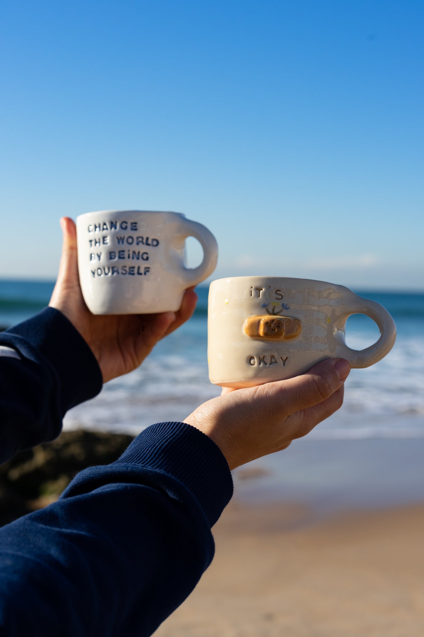 Each mug is carefully handcrafted and hand-painted, making no two exactly alike. Slight variations in shape and color remind us that perfection isn't the goal—it's okay to be exactly as they are.