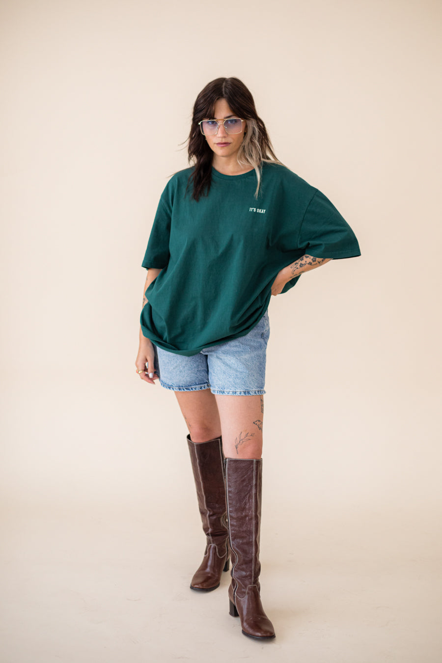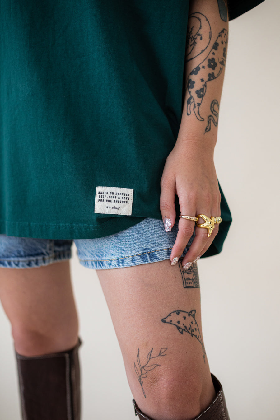 Our forest green organic t-shirt is one of our best-sellers. This tee is crafted from 100% organic cotton in North Portugal. This 220gsm is adorned with our embroidered brand name on the front and a circle logo on the back. Perfect for your everyday mood, this green organic t-shirt provides a comfortable and relaxed fit for enhanced comfort. Check out the exterior label at the bottom, reflecting our values of respect, self-love and love.